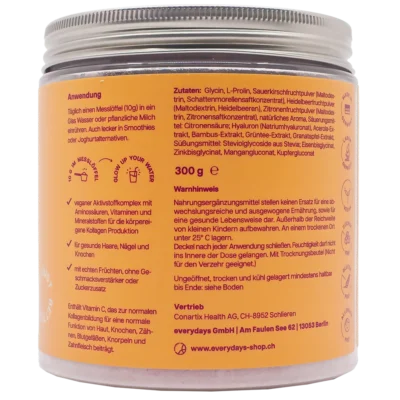 Health Claim legitimation: Kupfer trägt zur Erhaltung von normalem Bindegewebe bei und dazu, die Zellen vor oxidativem Stress zu schützen. Eisen hat eine Funktion bei der Zellteilung. Mangan trägt zu einer normalen Bindegewebsbildung bei. Vitamin C trägt zu einer normalen Kollagenbildung für eine normale Funktion der Haut, der Knochen, des Knorpels und der Blutgefässe bei. Vitamin C trägt ausserdem dazu bei, die Zellen vor oxidativem Stress zu schützen. Zink trägt zur Erhaltung normaler Haut, Haare und Nägel bei.