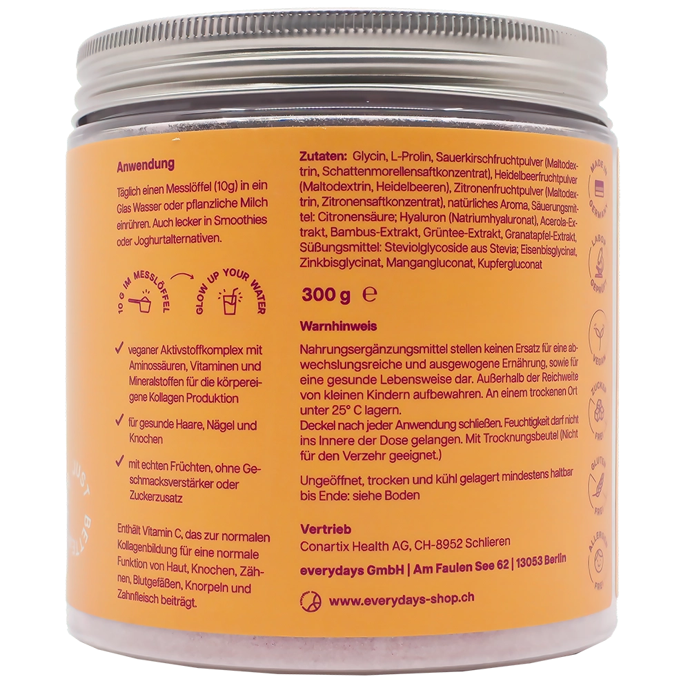 ✔ bietet dir Kollagenbausteine, Hyaluronsäure, Mineralstoffe, und Vitamine, welche zur Kollagenbildung und zum Erhalt des Bindegewebes beitragen.