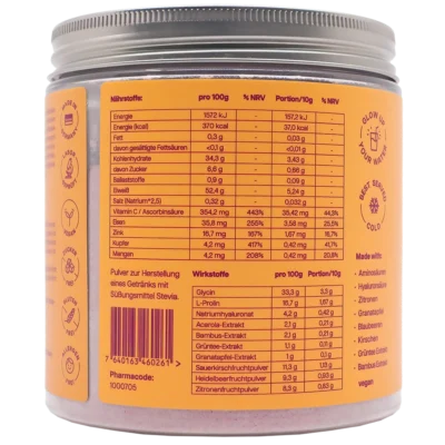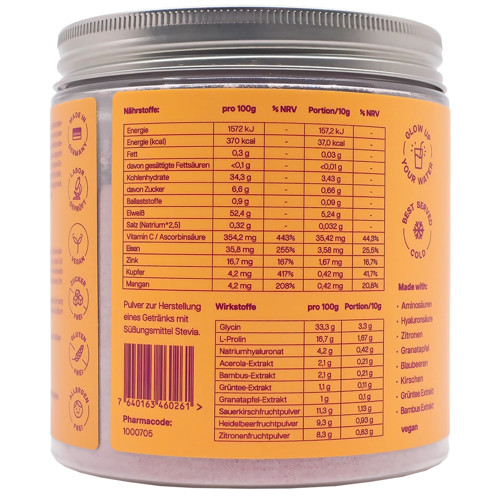 Mische das Pulver einfach in Wasser oder in deinen Smoothie. Glow hat einen fruchtig-beerigen Geschmack und ist gut löslich in allen Flüssigkeiten. Es enthält Sauerkirschen- Heidelbeer- Granatapfel und Zitronenfruchtpulver. Dazu Grüntee-, Vitamin C haltiger Acerola- , Granatapfel- und siliziumhaltiger Bambusextrakt.
