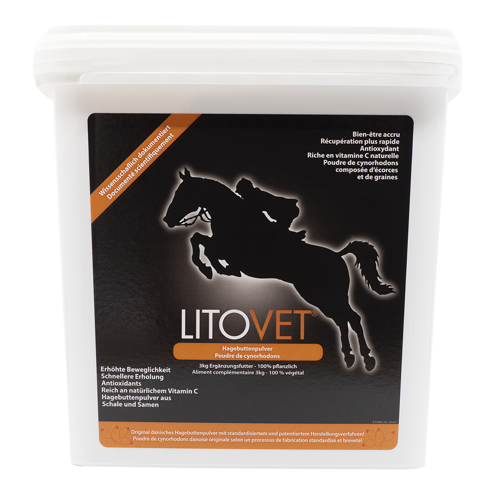 --inkl. MwSt, zzgl. Versandkosten (kostenlos ab CHF 80.-)Ergänzungsfuttermittel für Pferde. LitoVet® ist ein 100% natürliches Futtermittel auf der Basis von sorgfältig ausgewählten Hagebutten der Sorte Rosa Canina Lito®.