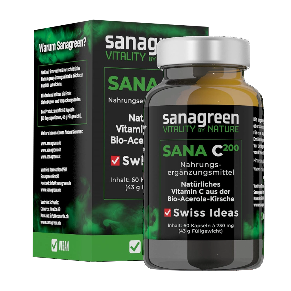 Für das Sana C200 werden die Acerola-Beeren püriert und gefriergetrocknet. Es entstehen dabei aus 17 kg frischen Beeren 1 kg Pulver, welche ohne weiteren Zusätze in vegane Kapseln abgefüllt werden. Der Gehalt an Vitamin C liegt bei 30%. Eine Kapsel (716mg Pulver) enthält somit mindestens 200mg natürliches Vitamin C. Jede Charge ist laborgeprüft.